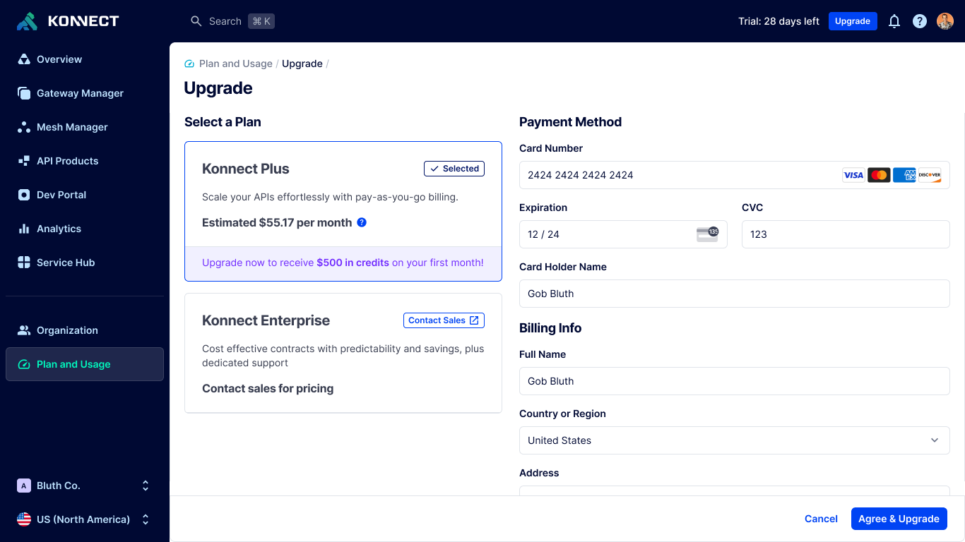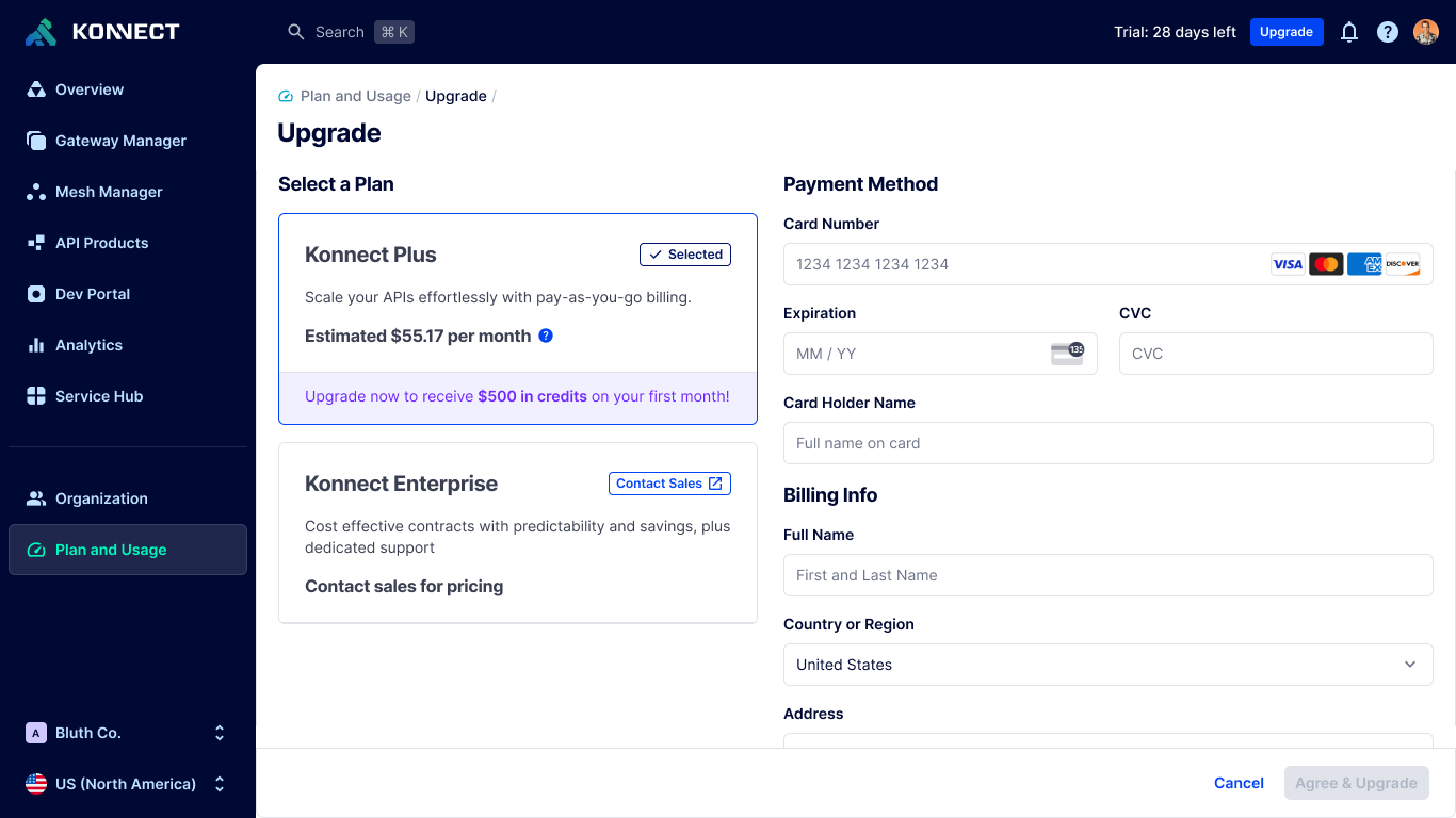 The upgrade flow was handled entirely through Stripe, taking customers completely out of the Konnect experience. Users were not presented with enough information about what they were about to be billed. Rebuilding this natively, alongside updating the billing page, gave us a more complete approach to the conversion problem rather than patching around it.